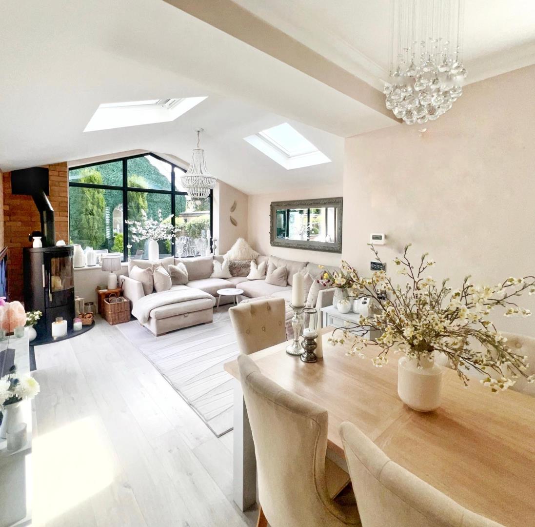 Fitted with a matching range of base & eye level units. Including matching island unit. Appliances - Bosch. Counter tops - Quartz. Dishwasher. Extractor hood Overhead. Fully fitted kitchen. Hob - Gas. Kitchen / Living Room. Kitchen diner. Tumble Dryer. Washing machine. Pantry. Spacious. Underfloor heating. Storage. Alcoves with shelving. Laminate flooring. Coving to ceiling. Vaulted Ceiling. Double bi-fold door. Door to garden. Windows to side. Windows to rear. Sash window. Electric shutter to window. Velux window. Stove with glass door. Wood burner fire. TV aerial point. Telephone socket. Central heating radiators. Cat 6 Network point. Dimmer controlled lights. Recessed spot lights. Chandelier. Down lighting. Pendant lights. Open Plan Living .