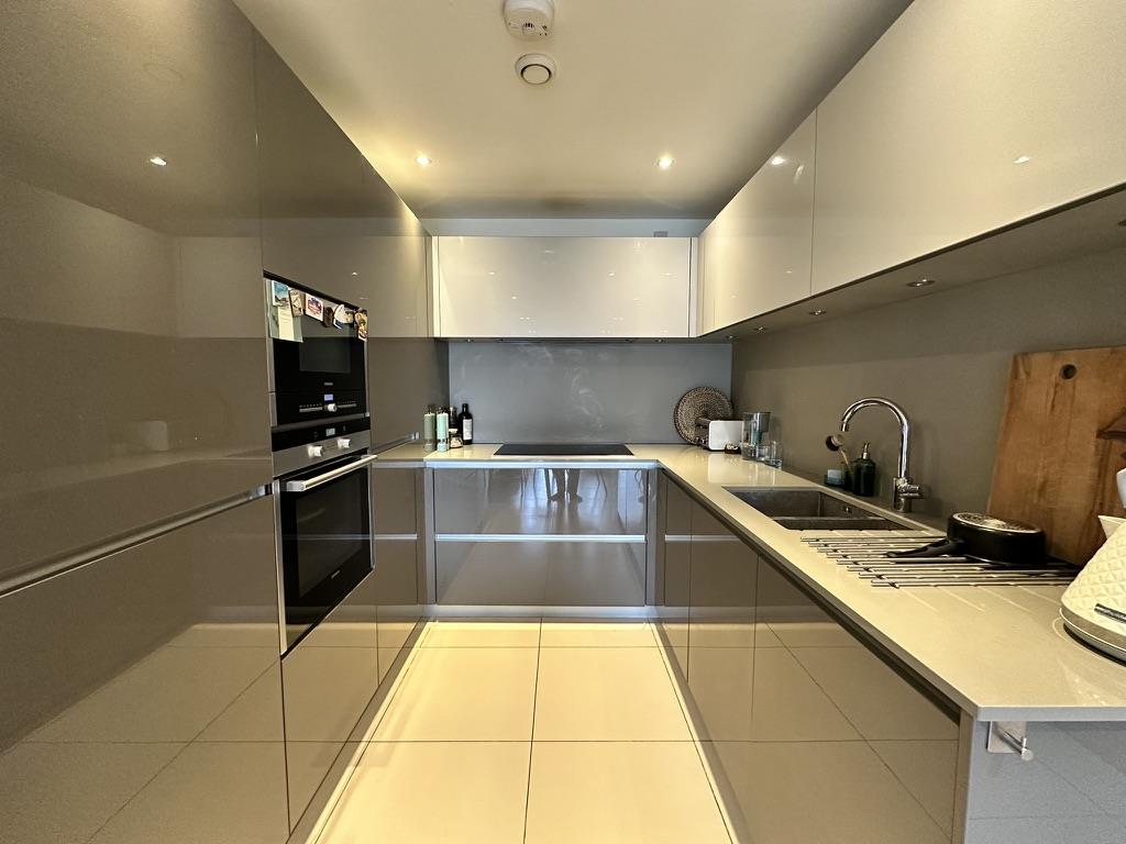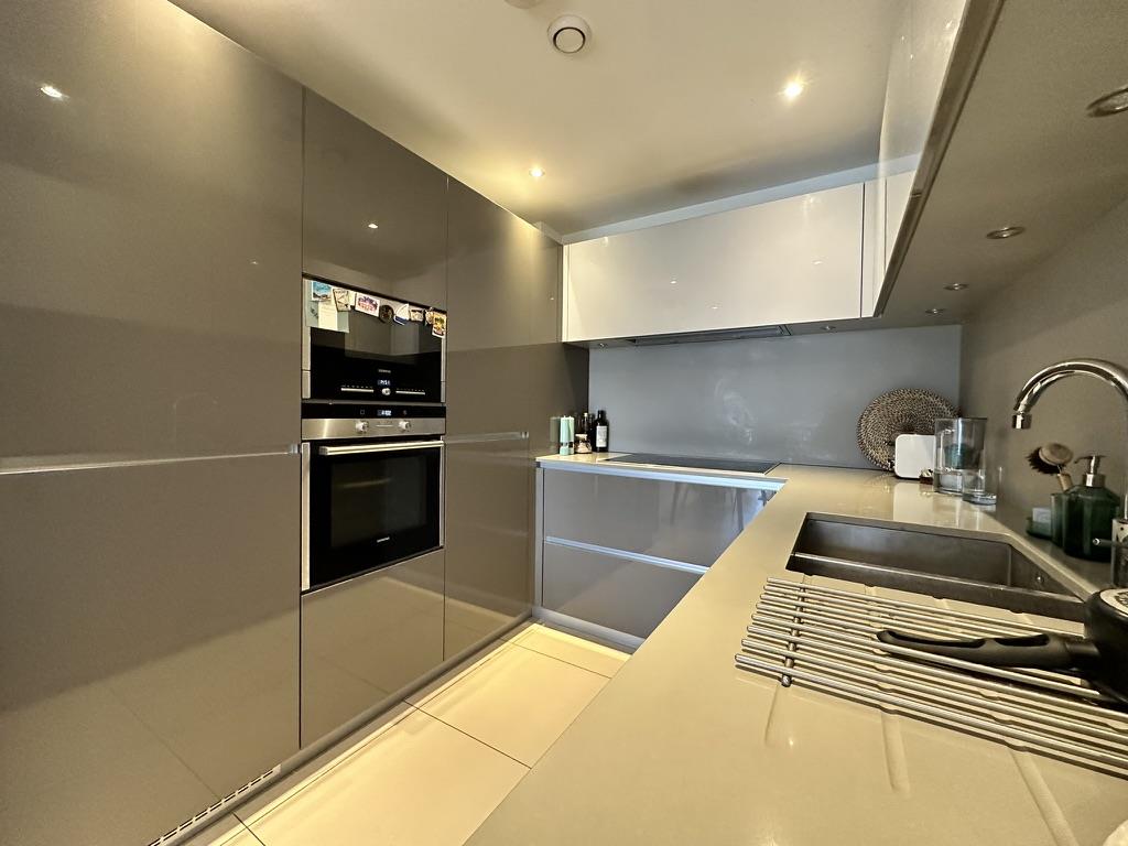 The kitchen to the far right has a modern and glossy grey finish with Siemens induction cooker, integrated fridge/ freezer and Bosch integrated dishwasher