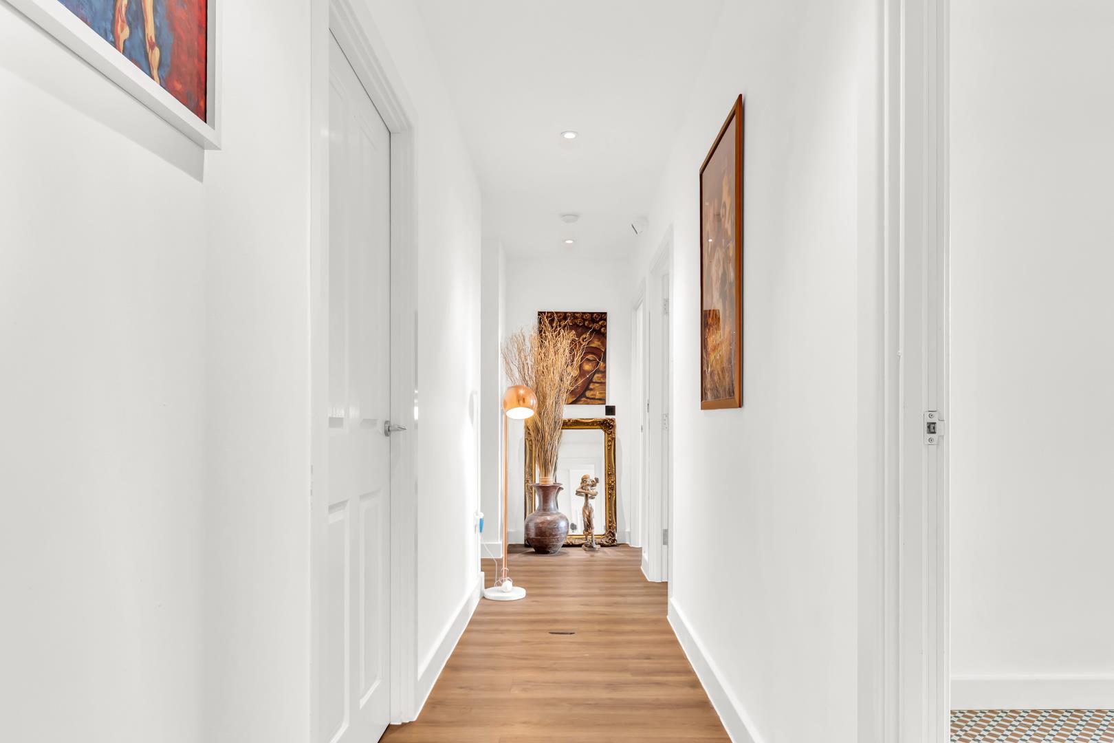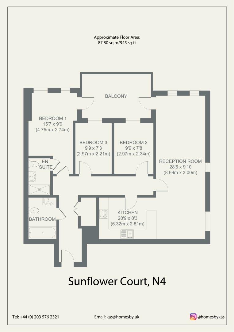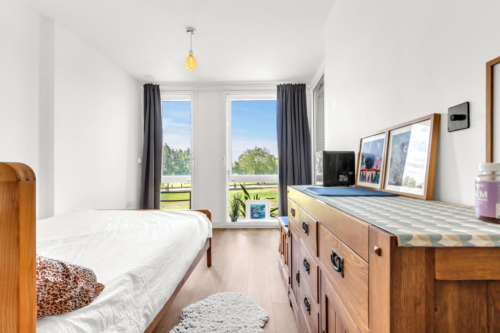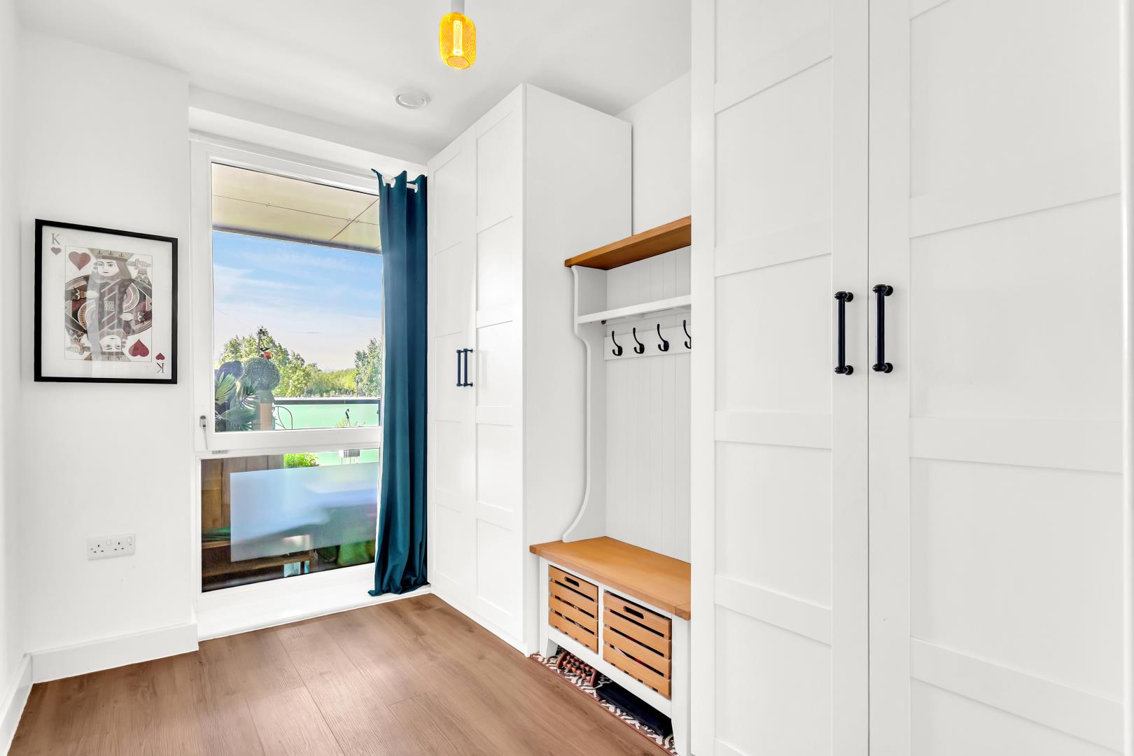 Ahead of the hallway are the three bedrooms. The master bedroom far to the left has the most stunning view of Finsbury Park with two sound proof windows, doorway to the far right leading to the balcony and access to its own en suite which has a towel radiator, wall hanging vanity unit with mirror above and shower enclosure with power shower and a well sized glass/ sliding shower enclosure.