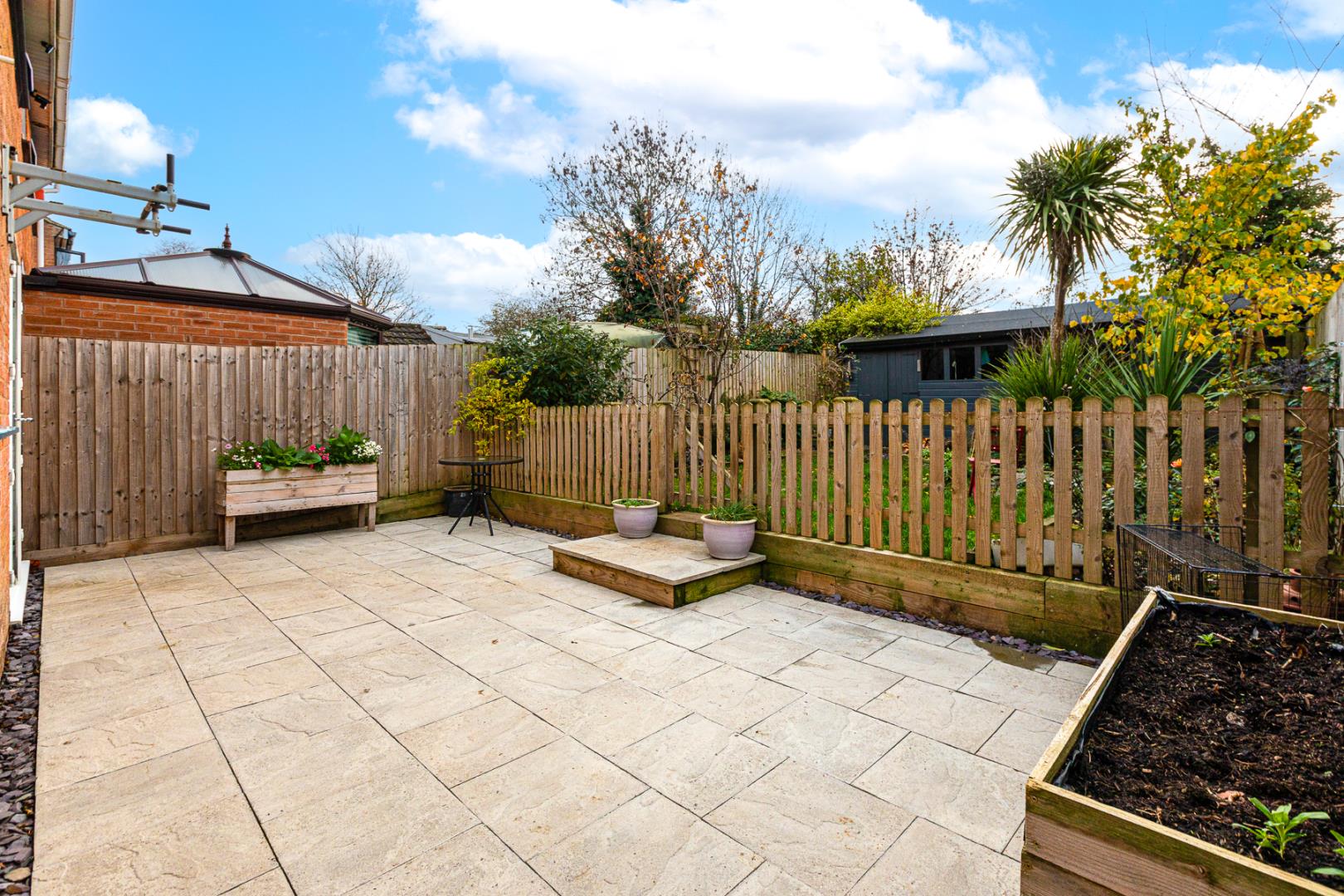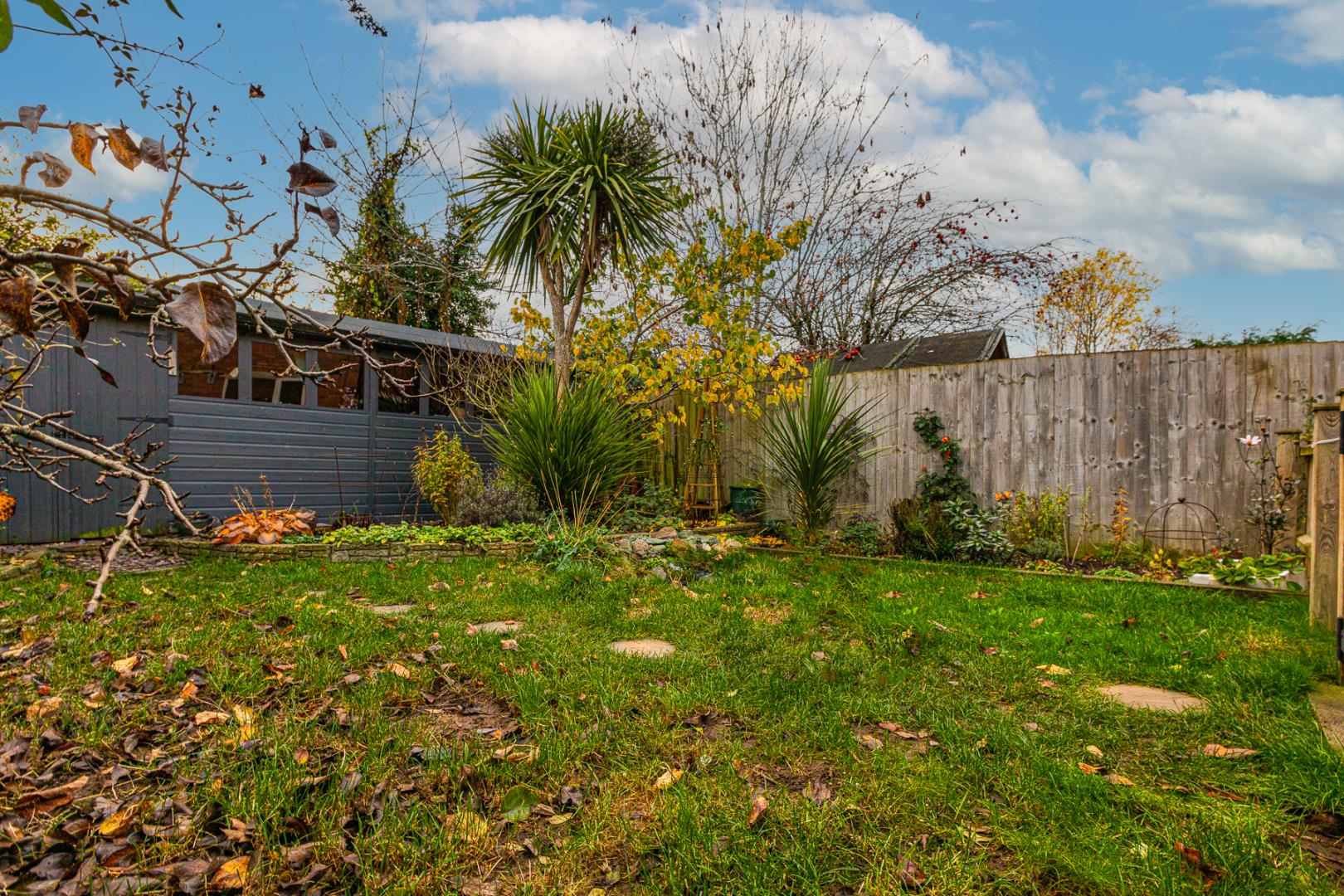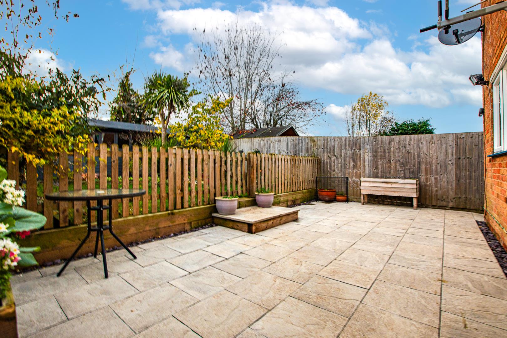 To the rear, the property boasts a private, non-overlooked garden featuring a patio area, mature shrubs, a well-maintained lawn, and stepping stones that lead to the bottom of the garden. A fantastic addition is the versatile outhouse — ideal for use as a workshop, home gym or office.