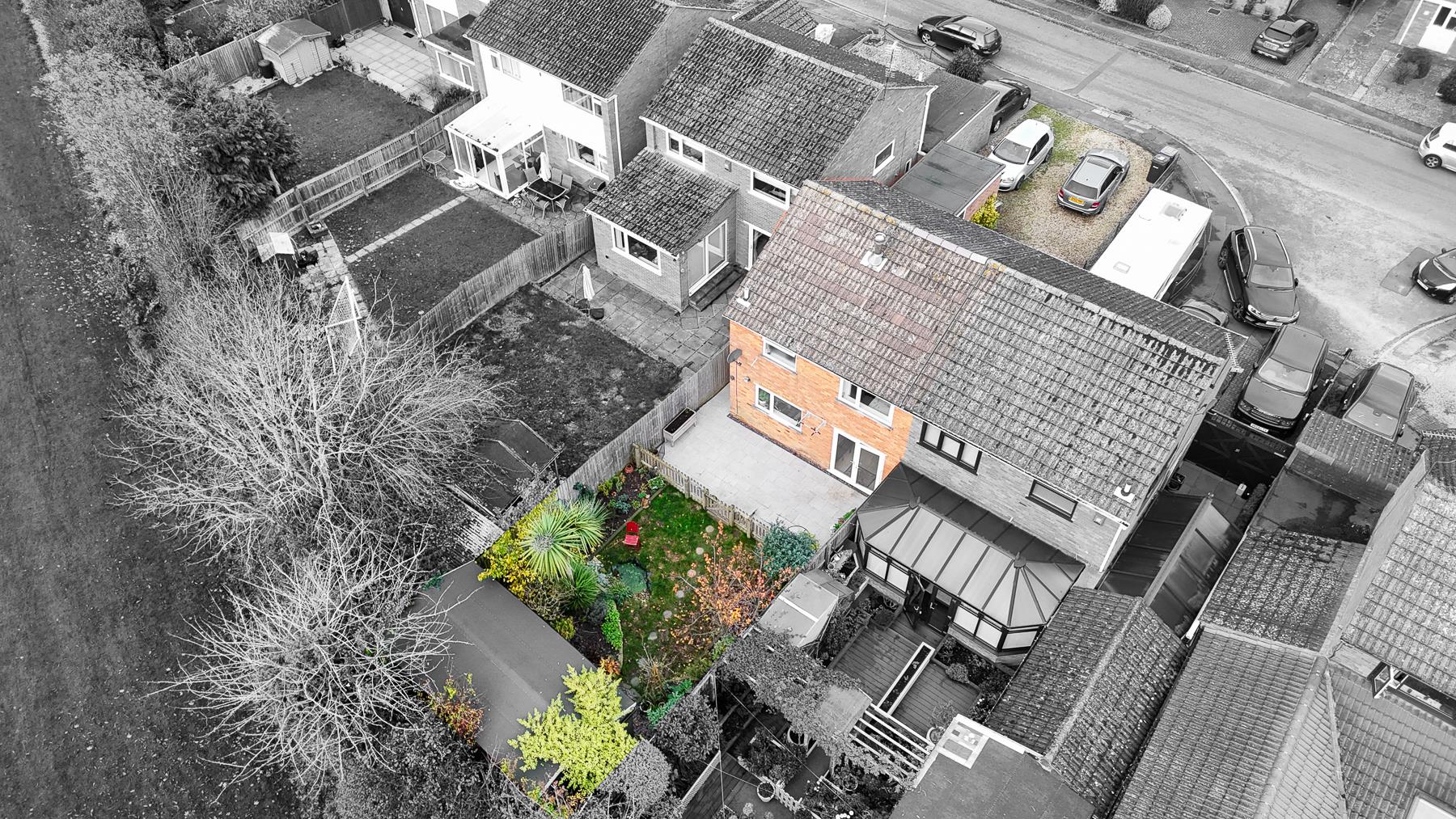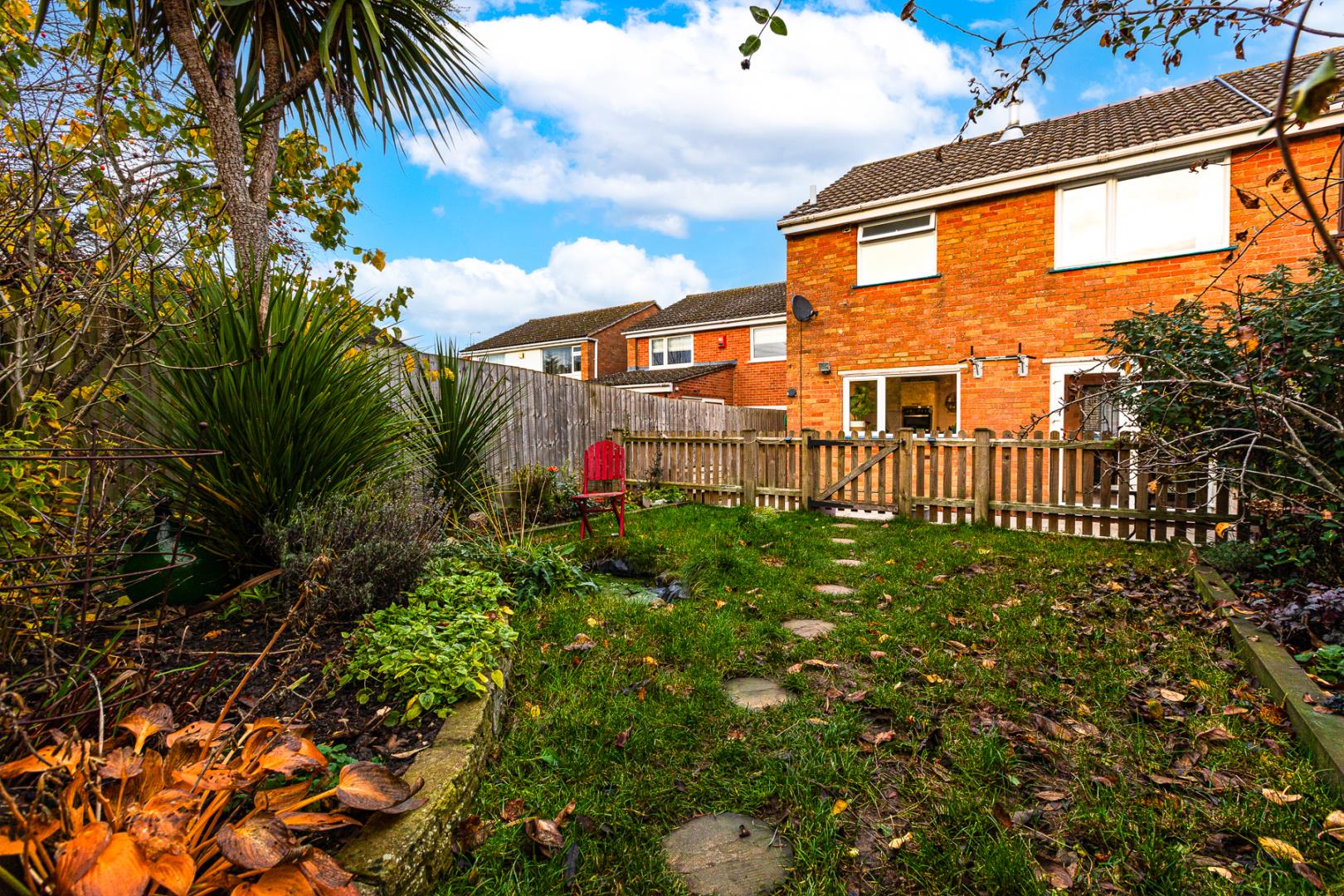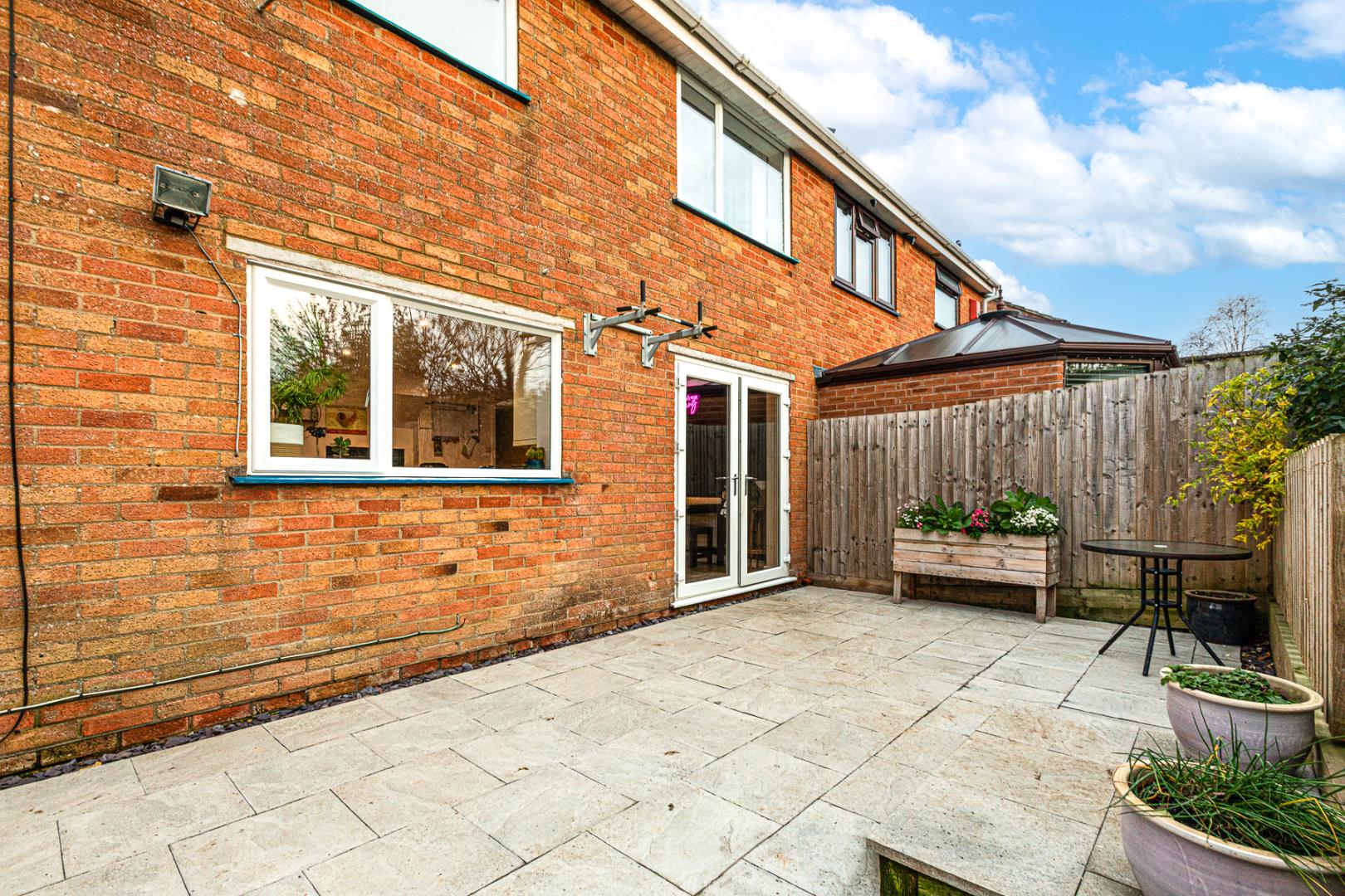To the rear, the property boasts a private, non-overlooked garden featuring a patio area, mature shrubs, a well-maintained lawn, and stepping stones that lead to the bottom of the garden. A fantastic addition is the versatile outhouse — ideal for use as a workshop, home gym or office.