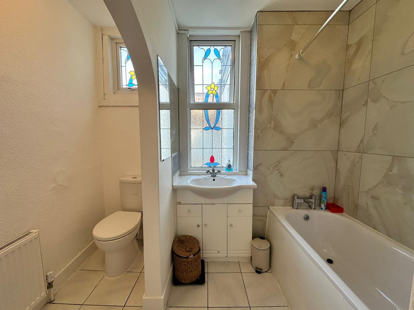 To the right of the hallway is the family bathroom. The bathroom has a light tiled flooring, beautiful stained glass window, full size bath tub with power shower (handheld) and a vanity unit with storage cupboard.