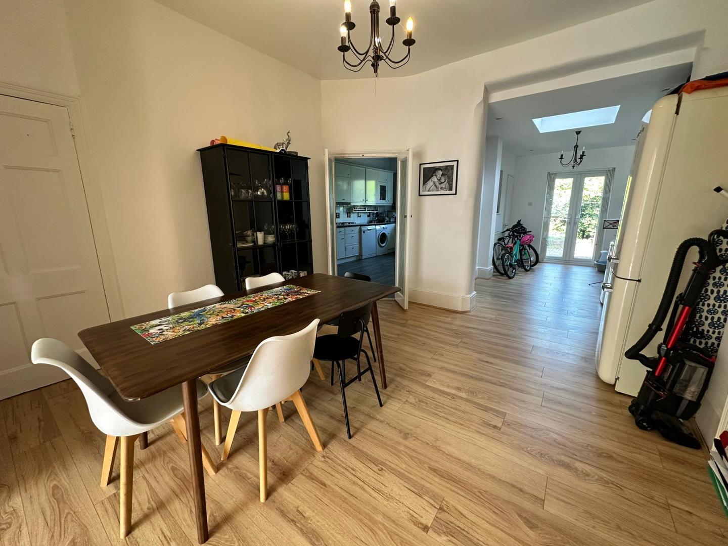 The dining place has the continuation of flooring with storage cupboard to the right and ahead to the rear of dining room is access to the garden.