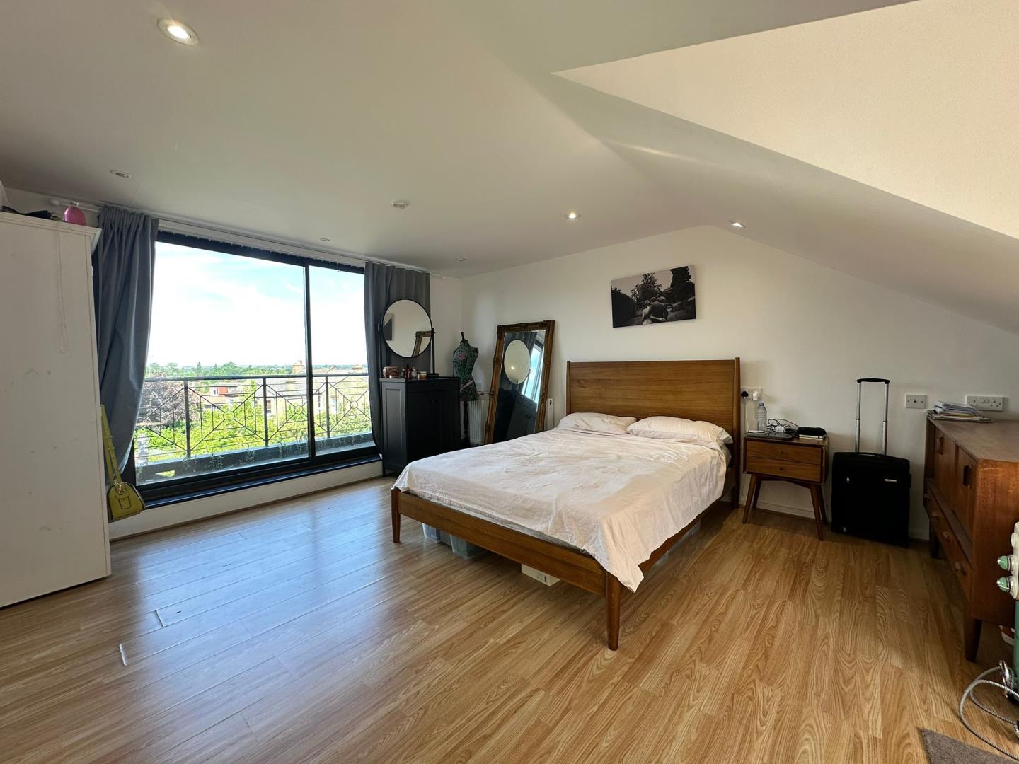 The bedroom in the loft has a wooden flooring and a pitched room providing great space for storage. This bedroom has a balcony/ terrace with views onto the rear and great for a miracle morning wake up routine. A great place to have a coffee and read.